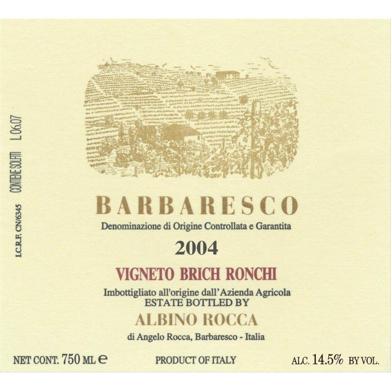 Il Barbaresco di Albino Rocca nasce in vigneti situati nel favoloso panorama di Barbaresco, un territorio noto per la produzione di vini di grande pregio.È prodotto esclusivamente con uve Nebbiolo, raccolte a mano durante il mese di ottobre. La fermentazione avviene in vasche di acciaio inox a temperatura controllata. Successivamente il vino affina in botti per circa 20 mesi prima di essere imbottigliato.È caratterizzato da un colore rosso rubino granato. Al naso si apre con profumi di frutti rossi, arricchiti da piacevoli note speziate e delicate sfumature di liquirizia. Al palato risulta elegante, piacevolmente fruttato e con un corpo intenso.Perfetto per accompagnare piatti con ragù di carne, è ideale in abbinamento ad arrosti, carni in umido e formaggi stagionati.