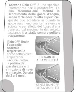 - Rain Off è un trattamento speciale per parabrezza applicato prima di piovere, crea una pellicola impermeabile che favorisce gocce scorrevoli e 50/60 km/h.